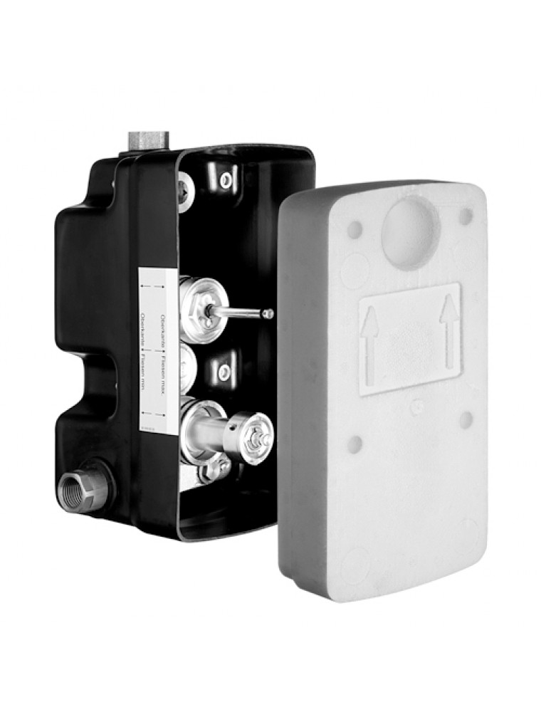 Schell WBD-SC-T falba építhető masterbox Funkció: önelzáró - termosztátos Falba építhető szerelvény a zuhanyok készreszerelő készletével történő beépítéshez, a szerelvény előre be van építve egy műanyag falba építhető dobozba, mely tömített átvezető nyílásokkal és kábelátvezetésekkel rendelkezik, valamint az első keret felerősítéséhez szükséges rögzítési lehetőségekkel ellátott. A szerelvényház úgy van kialakítva, hogy utólagosan beépíthető a termikus fertőtlenítésre alkalmas mágnesszelep (tartozék). Kiszerelés tartalma: - SC-V típusú önelzáró kartus - Termosztátos kartus az EN 111 normának megfelelően elzárható hőmérsékletkorlátozással 38 °C és hidegvíz kitörés esetére biztonsági szeleppel rendelkezik - Előelzárószelep - Előszűrő - Visszafolyásgátló - Öblítőcsonk - Rögzítő alkatrészek valamint vakolat alatti takarófedél Felhasználási terület / műszaki adatok: - Átfolyási mennyiség ≤ 15,0 l/perc 3 bar víznyomás esetén - Víznyomás 1,0 - 5,0 bar között, működési idő: 5 - 40 másodperc között - Hőmérséklettartomány: 5 - 45 °C (70 °C, kizárólag rövid idejű használat esetén) - Méretek: 246 mm x 125 mm x 125 mm - Beépítés mélysége: 88 - 112 mm, vízcsatlakozások: belső menet: 1/2" - Alapanyag: vizes alkatrészek kiválásmentesített sárgarézből - Zajosztály: I - Engedélyszám: P-IX 18001/IA, Belgaqua - Súly: 3,08 kg