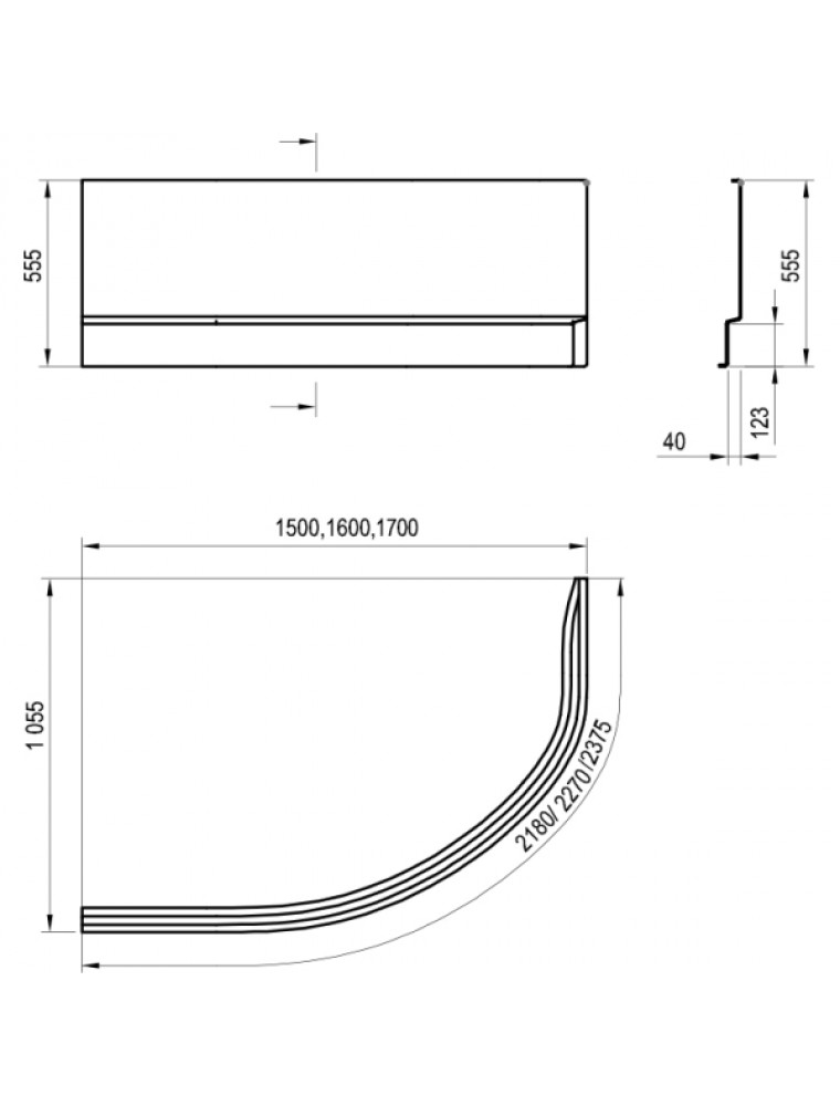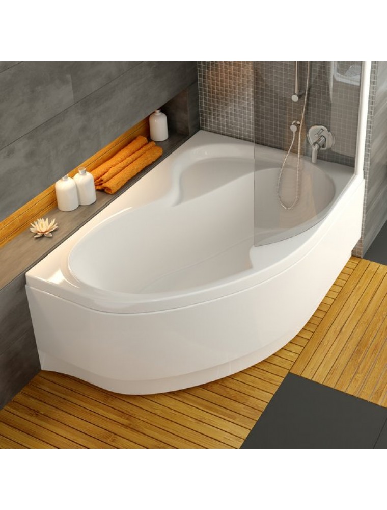 A Rosa II balos 170 x 105 aszimmetrikus fürdőkád előlapja. Az akril előlap rögzítéséhez szükséges az univerzális Rosa panelkit (szerelőkészlet) megvásárlása.