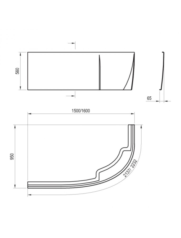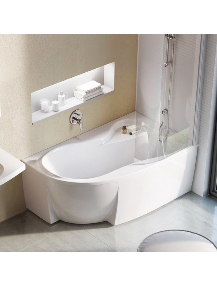 A Rosa 95 balos 150 x 95 aszimmetrikus fürdőkád előlapja. Az akril előlap rögzítéséhez szükséges az univerzális Rosa panelkit (szerelőkészlet) megvásárlása.