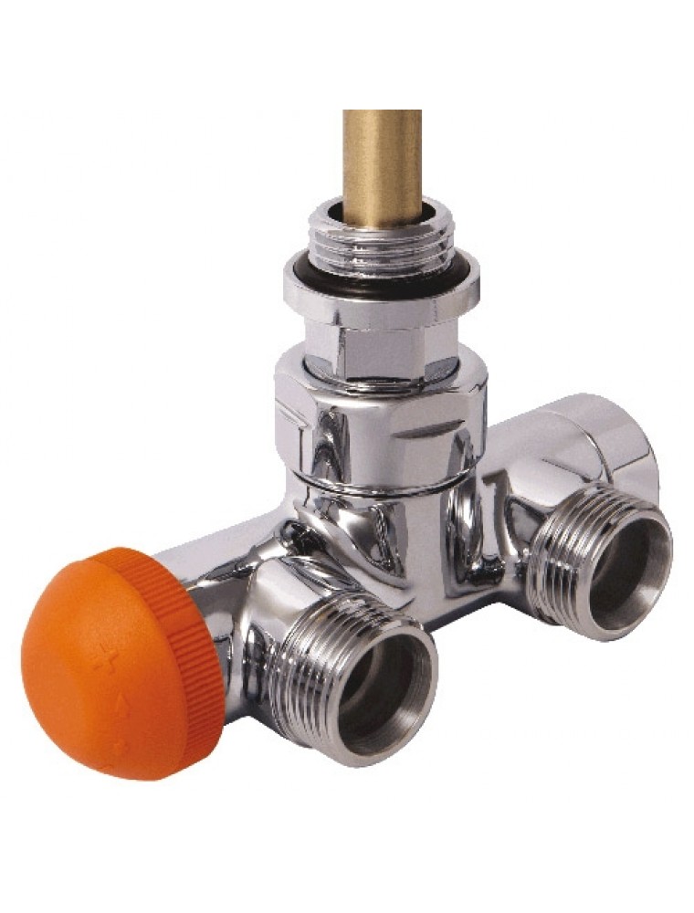 négyjáratú termosztatikus szelep kétcsöves üzemre, előbeállítható, merülőcsővel L = 290 mm, Ø 11 mm, by-pass nélkül, krómozott kivitel, termosztatikus fej csatlakozása - M 28 x1,5; csatlakozó tengelytávolság - 50 mm, csőcsatlakozás M 22 x 1,5.