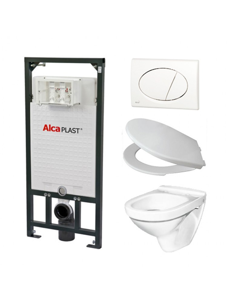 Alcaplast A101 WC szett - falba építhető WC tartály szerelőkerettel, fehér nyomólappal, csészével, ülőkével